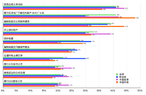 研究顯示,不同國家或地區(qū)以及不同行業(yè)在合規(guī)方面所面臨的挑戰(zhàn)存在顯著差異。中國香港和新加坡的公司在緊跟法規(guī)變化方面最為吃力,銀行、投資管理公司和企業(yè)服務提供商也面臨類似問題。中國內地企業(yè)最擔心的是如何履行反洗錢和“了解你的客戶(KYC)”義務,而家族辦公室和咨詢公司則在保護數據方面面臨嚴峻挑戰(zhàn)。