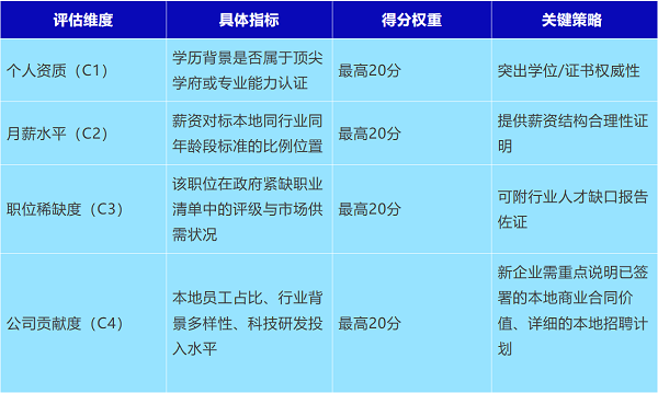 所有薪資未達豁免標準者,必須在COMPASS框架的綜合評估(滿分100分)中累積至少40分。該模型從四個維度精準量化申請人價值: