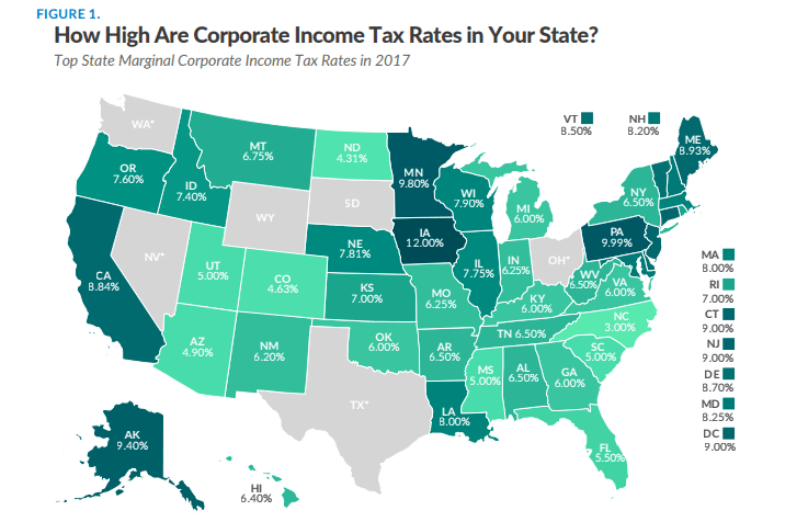 44個州征收企業所得稅。稅率從北卡羅萊納州的3%到愛荷華州的12%。