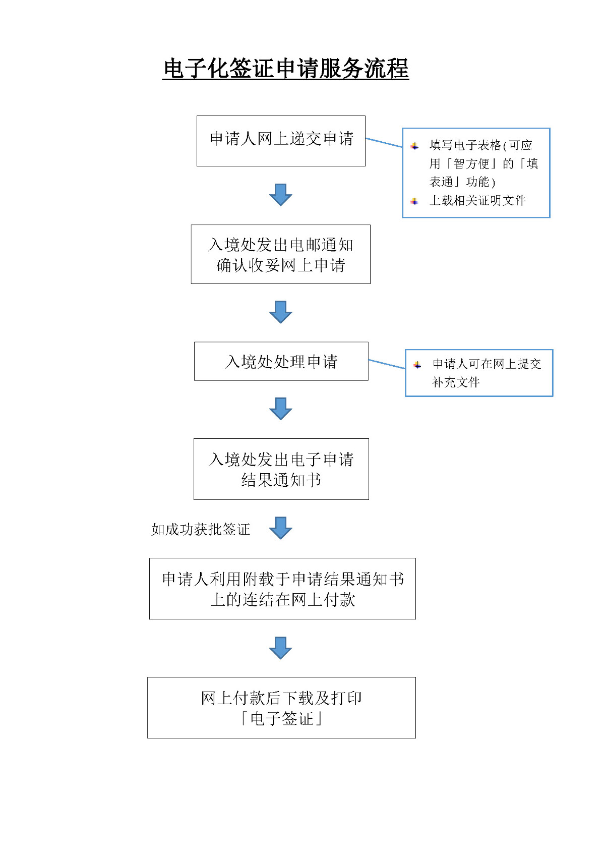 符合條件的申請人無需親身前往入境處辦事處,而可在網上完成整個申請程序,包括通過入境處流動應用程序、入境處網站或香港政府一站通網站遞交簽證,于申請獲批后通過網上付款程序繳納相關費用,并在繳費成功后即時下載“電子簽證”,以PDF形式儲存于個人流動設備中或進行打印。